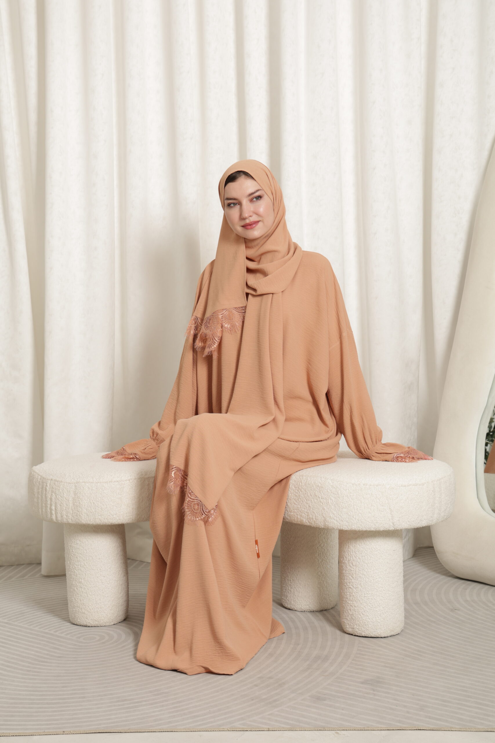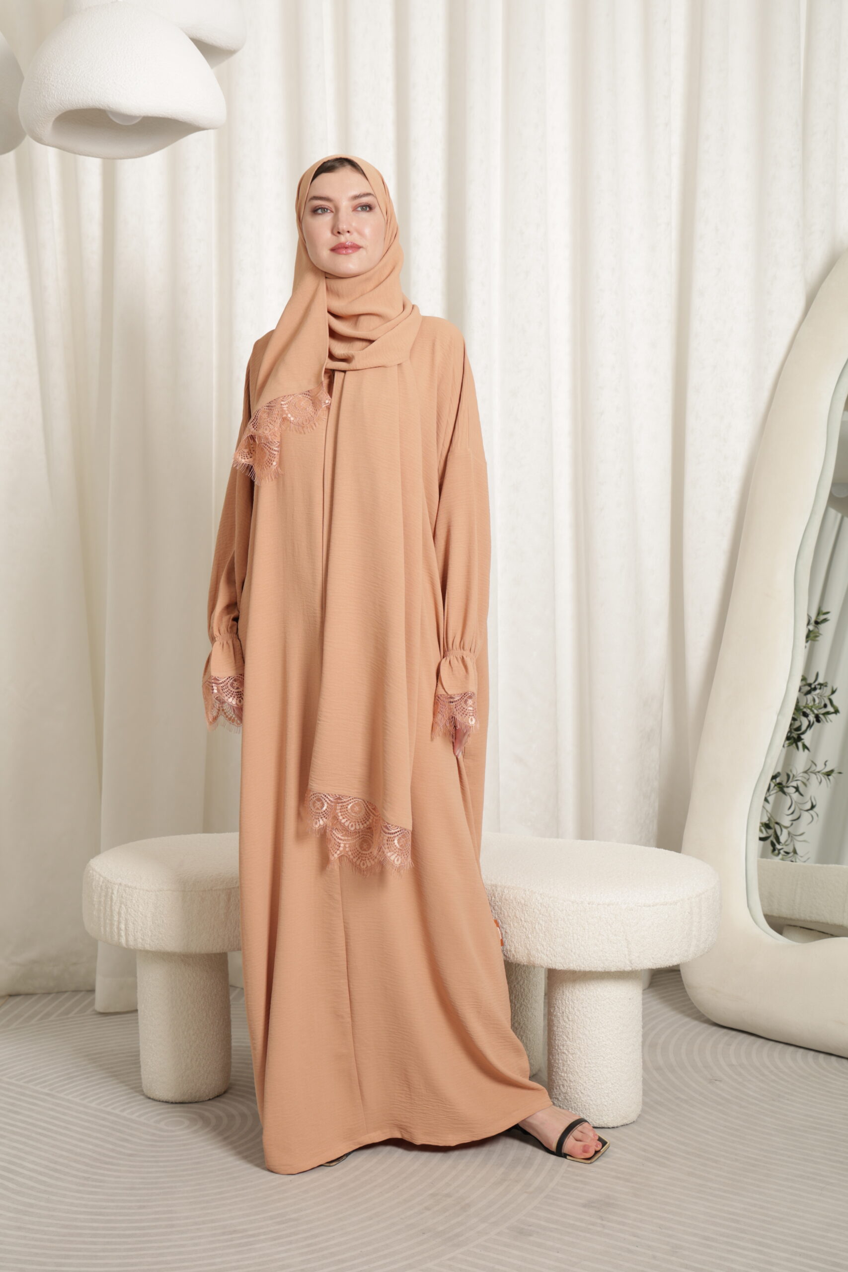 الشيلة التي تأتي مع اللبس تقدم لك خيارات عديدة، حيث يمكنك لفها يميناً أو يساراً حسب أسلوبك الشخصي. الدانتيل الفرنسي يضيف لمسة من الفخامة والجاذبية.